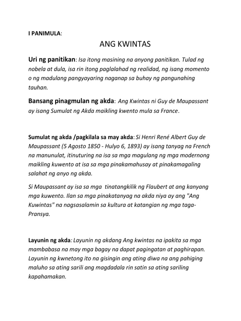 Nobela Mula Sa France Ito ay ang pagsasalaysay ng maraming pangyayaring magkasunod at magkakaugnay. Kilala bilang Ama ng Maikling Kwento. French ng Ang Kwintas.