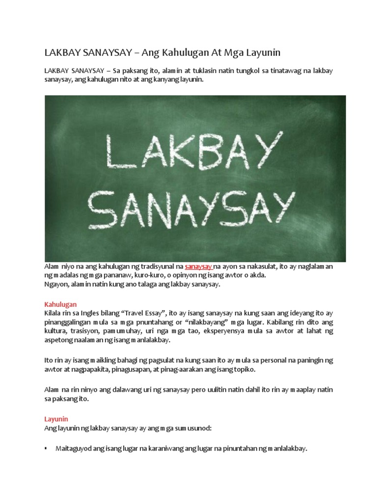 Ang sulating ito ay tungkol sa kung ano ang natuklasan ng manunulat tungkol sa lugar na pinuntahan niya sa mga taong nakasalamuha niya at higit sa lahat tungkol sa kaniyang sairili. Ang ibig sabihin ng Lakbay Sanaysay o Travel Essay sa wikang Ingles ay sanaysay na ang pinanggagalingan ng mga ideya nito ay mula sa pinuntahang lugar hindi lamang ang lugar ang tinatampok dito pati na rin ang mga kultura tradisyon pamumuhay uri ng mga tao damdamin ng isang taong nakaranas pumunta sa partikular na lugar at lahat ng aspektong. Sanaysay meaning lakbay ang Etc essayEssay about the person you interviewed essay on ayushman bharat national health protection mission lala lajpat rai.