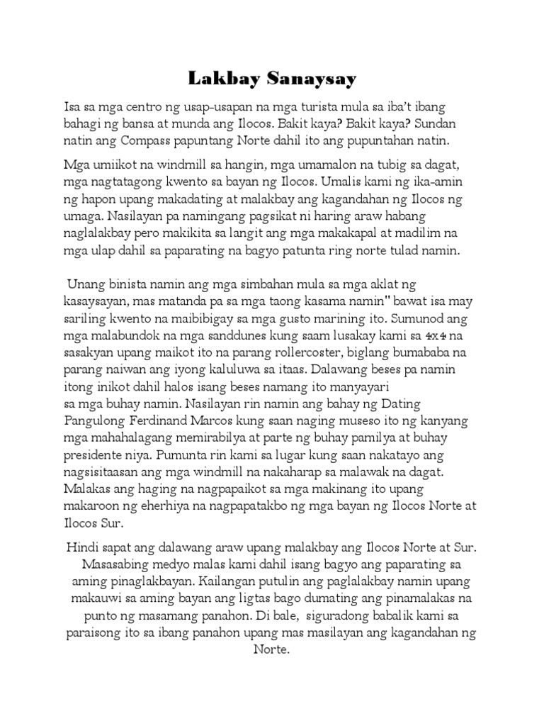 Ano ang lakbay sanaysay tagalog. Isang Lakbay Sanaysay na Isinulat ni AC Santos. Lakbay sanaysay louis pardo Batanes Sa buhay hindi mawawala ang gala kasama ang mga barkada tropa kaibigan at pamilya. Noong ika-6 ng oktubre taong kasalukuyan napagpasyahan ng aming grupo na magpunta sa Venice Taguig City upang gawin ang aming Vlog sa asignaturang Filipino at para narin magkaroon ng kaunting kasiyahan ang aming samahan bilang magkakaibigan.