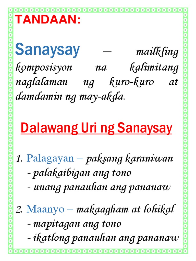 Ano ang dalawang uri ng sanaysay. Karaniwang ang paksa ng mga sanaysay ay tungkol sa mga kaisipan at bagay-bagay na maaaring kapulutan ng mga. SANAYSAY Ayon kay Alejandro G.