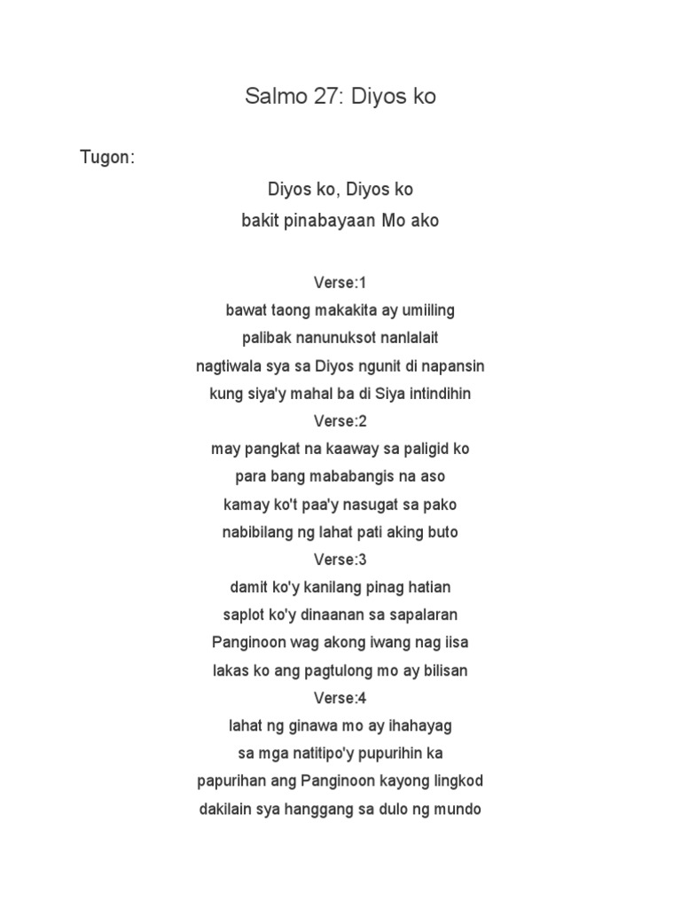 46 Marahil karamihan sa atin ay nakapagtanong na minsan sa ating buhay ng mga katagang Diyos koDiyos ko. Dublin base sa Salmo Serye 2 Diyos ko Diyos ko Bakit pinabayaan Mo ako Bawat taong makakita ay umiiling Palibak nanunuksot nanlalait Nagtiwala sya sa Diyos ngunit di napansin Kung siyay mahal ba di Siya intindihin Diyos ko Diyos ko Bakit pinabayaan Mo ako May pangkat na kaaway sa paligid ko Para bang. 2 Oh Dios ko akoy humihiyaw sa araw ngunit hindi ka sumasagot.