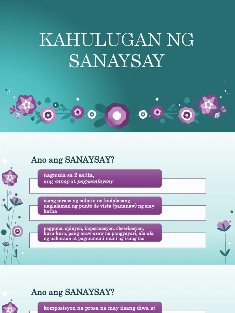 SANAYSAY KAHULUGAN Sa araling ito ating matutunghayan kung ano ang kahulugan ng sanaysay sa Tagalog at mga bahagi halimbawa at uri nitoIto ay kinalap mula sa mga makatang Pilipino na siyang sumulat ng mga sanaysay na ating ginagamit at nagbibigay inspirasyon sa atin ngayon. Ang sanaysay ay anyo ng pagsasalaysay na mas maikli kompara sa ibang anyo nito tuiad ng maikling kuwento at nobela. Hindi bababa sa tatlong mahusay na naisulat na talata na mayroong malakas na sumosuportang ebidensya o detalye.