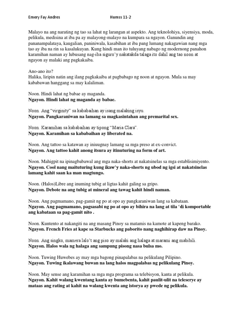Pagkakaiba ng noon at ngayon sanaysay. Ngayon ay kabaliktaran na mayroon pa rin namang mga kababaihan na konserbatibo ngunit iilan na lamang dahil karamihan ay liberated na kung tatawagin. Filipino sa Piling Larang Akdemik Pahina 61 Basahin ang isang halimbawa ng photo essay. Noong unang panahon maraming kultura at tradisyon ang mga Pilipino na dahil sa pag-angat ng teknolohiya at pag-uunlad ng bansa ay dahan-dahang nawawala.