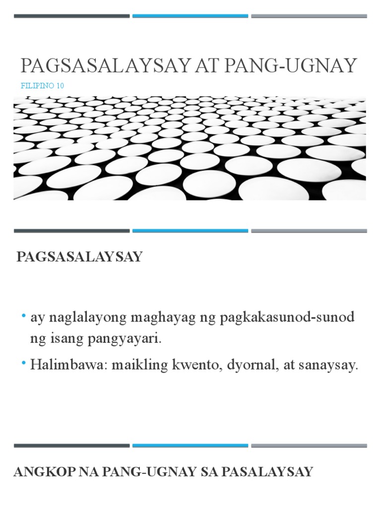 Salaysay ang tawag sa isang uri ng panitikan kung saan ang manunulat ay naglalahad ng impormasyon opinyon datos at iba pa depende na rin sa klase ng salaysay na kanyang gagawin. Tatlong uri ng Pang-ugnay. Mismong nagsasalaysay o magasasalaysay.