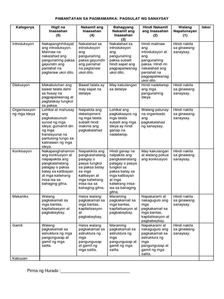 Rubrik Sa Pagsulat Ng Sanaysay Pdf