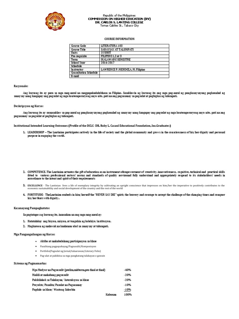 Flag for inappropriate content. View sanaysay at talumpati syllabuspdf from BS FILIPIN 103 at Bukidnon State University Main Campus Malaybalay City Bukidnon. Ito ay isang uri ng pakikipagkomunikasyon sa pamamagitan ng lathalain na may layuning maihatid ang nais na maipabatid sa kapwa tao.