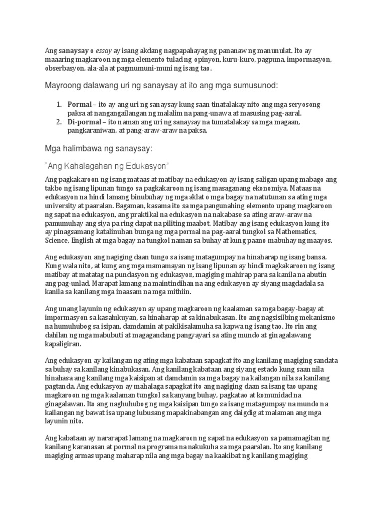 Kadalasan ang mga ito ay nakikita sa mga aklat at iba pang panitikang akademya. Mga Halimbawa Ng Di-Pormal Na Sanaysay. Mga Sanaysay Tungkol Sa Wika.