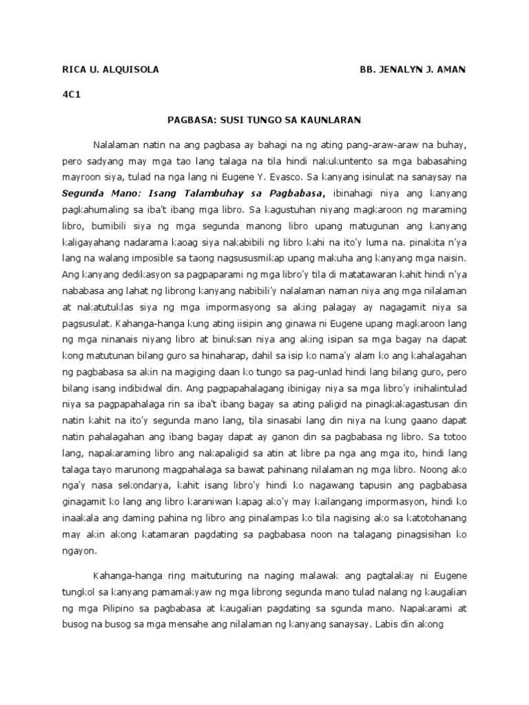 BAGO MAGBASA PAGBASA AT PAGSULAT TUNGO SA PANANALIKSIK METAKOGNITIV na PAGBASA. Ipagpatuloy lang ang pagbabasa hanggan sa dulo nang artikulong ito para makita mu ang mga nilalaman ng bawat isang Sanaysay tungkol sa Sarili. Read Sa PagbasaMay Pagasa from the story Piece Tula at Iba pa by JalliyahReaMasangkay Lia with 1643 reads.